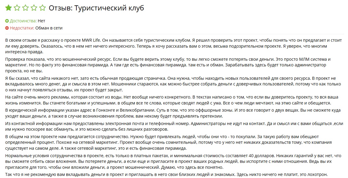 - множественные негативные отзывы о MWR Life.