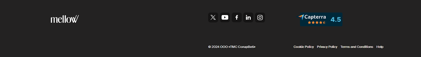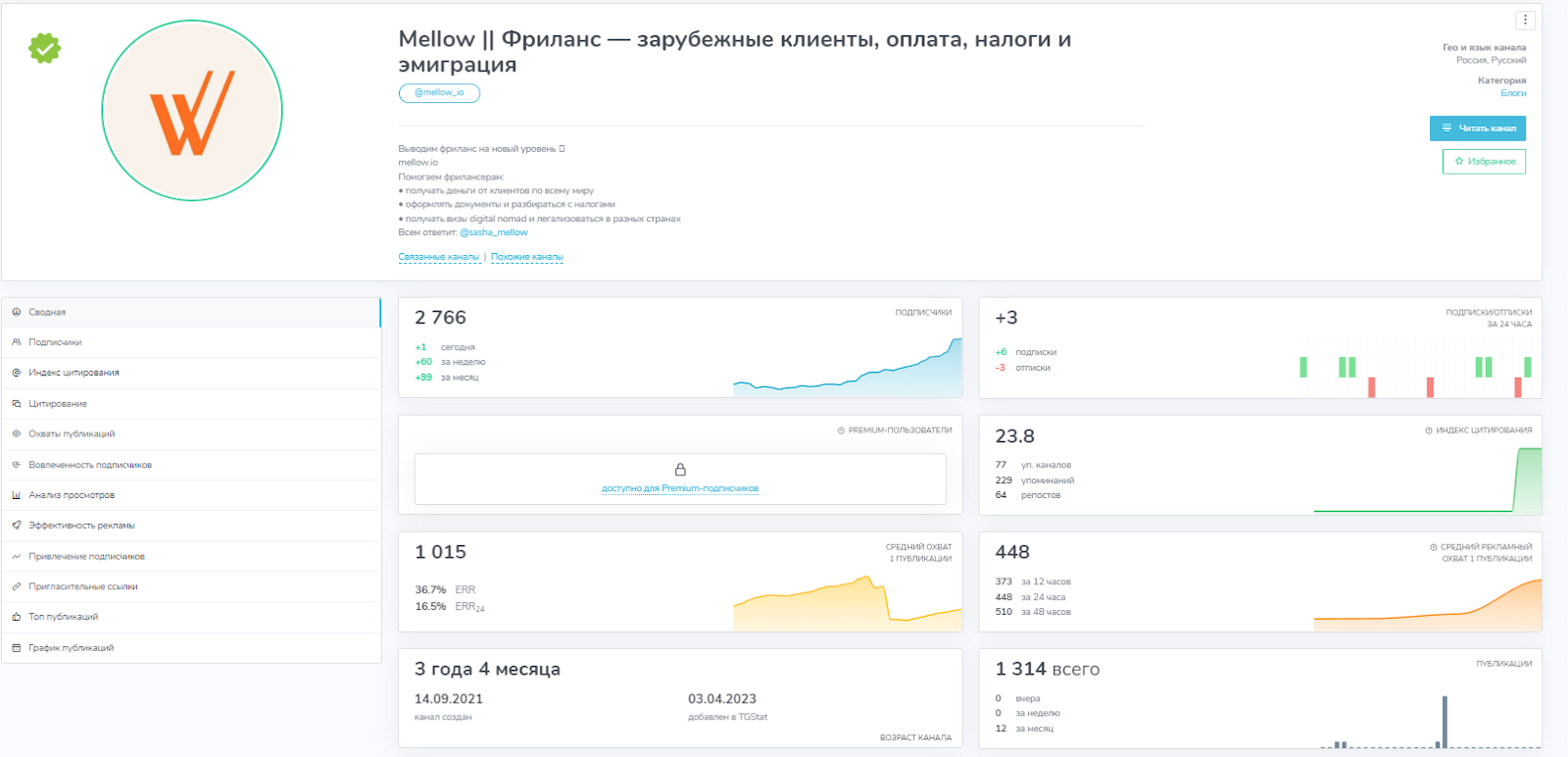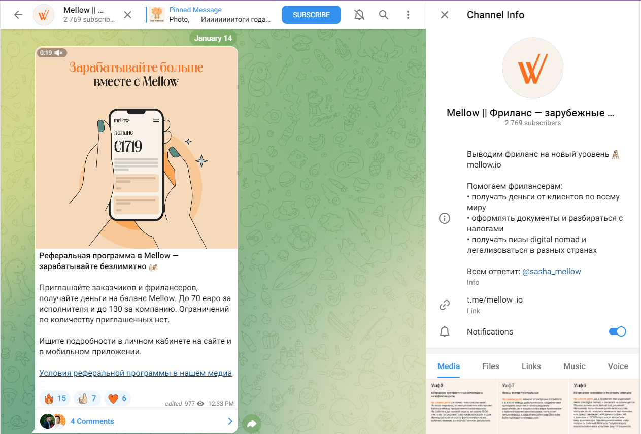 Среди социальных сетей, проект ведет X, Youtube, facebook, Instagram и телеграм канал. Контент везде дублируется, а также переводится на разные языки для удобства целевой аудитории.Телеграм канал “Mellow | Фриланс, зарубежные клиенты, оплата, налоги и эмиграция” был создан в 2021 году, однако первые публикации появились лишь в 2023. За такой небольшой промежуток времени команда собрала почти 3 тысячи подписчиков.