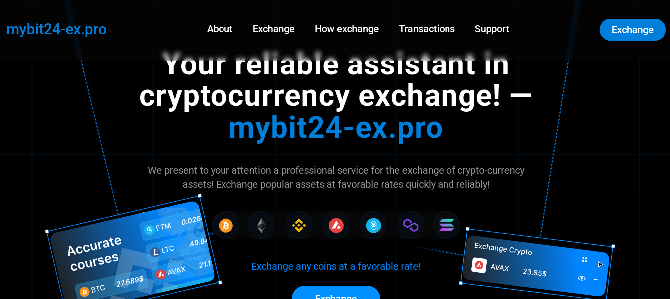 Mybit24 ex pro — криптовалютный обменник, который предлагает услуги обмена различных цифровых валют. Он ориентирован на англоязычный рынок, но доступен и для пользователей из России и СНГ. Авторы проекта заявляют о выгодных курсах, высокой скорости обмена и удобном интерфейсе. В этой статье мы расскажем, можно ли доверять этому сервису или Mybit24 ex pro скам.
