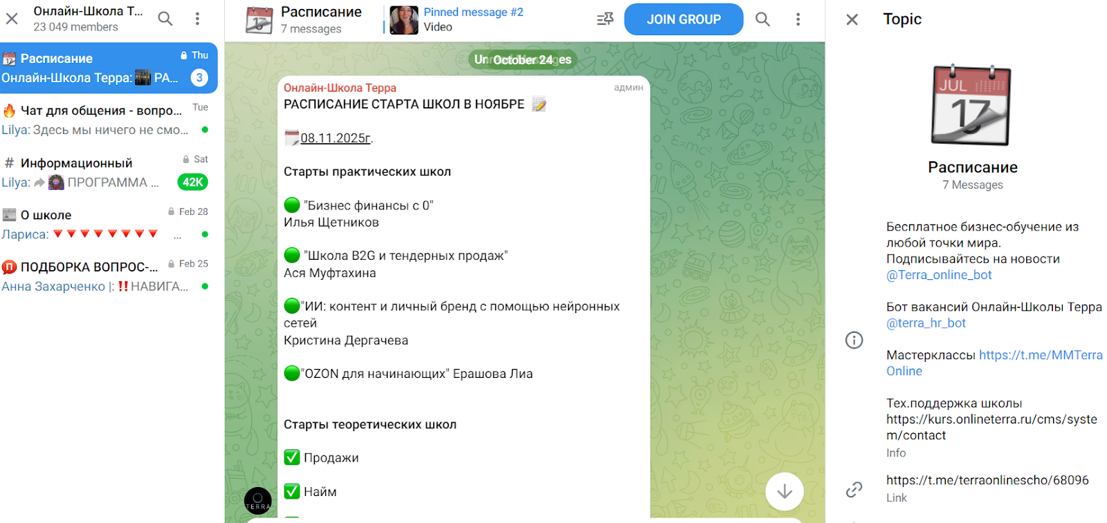 Из категорий доступна “Расписание”, в которой представлены актуальные даты старта обучения. В разделе “Информационный” админы рассказывают о правилах комьюнити, а в “О Школе” говорят о базовых сведениях проекта. В категории “Чат” пользователи могут проводить дискуссии. Другое тг-сообщество проекта можно найти по никнейму terra_priority.Помимо тг-канала у Терра есть группа VK Myterraofficial, созданная в 2022 году.