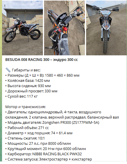 Продаются эндуро, квадроциклы, мопеды, электротранспорт и запчасти. Встречаются прайс-листы и анонсы поставок, но юридической информации, гарантийных условий и сведений о сервисном обслуживании нет.