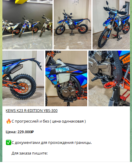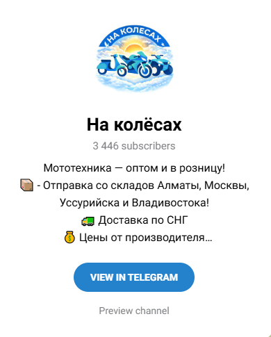 На Колесах – магазин в Телеграм, отзывы о котором еще не появились. Это паблик, в котором предлагается мототехника с поставками из Китая, России и Казахстана. Администратор @Na_Kolesach_1 заявляет оптовые и розничные продажи, цены «от производителя» и доставку по СНГ. Но никаких документов они не публикуют, в ленте отсутствует даже пользовательское соглашение.