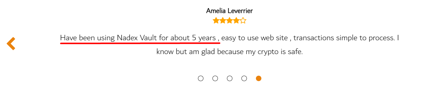 Отзывы о Nadex vault присутствуют только на сайте проекта, их опубликовали сами разработчики. Достаточно прочитать некоторые из них, чтобы понять насколько команда проекта хотела ввести потенциальных клиентов в заблуждение. К примеру, некая Амелия утверждает, что использовала кошелек в течение пяти лет, но еще четыре месяца назад сайта, как и сервиса, не существовало.