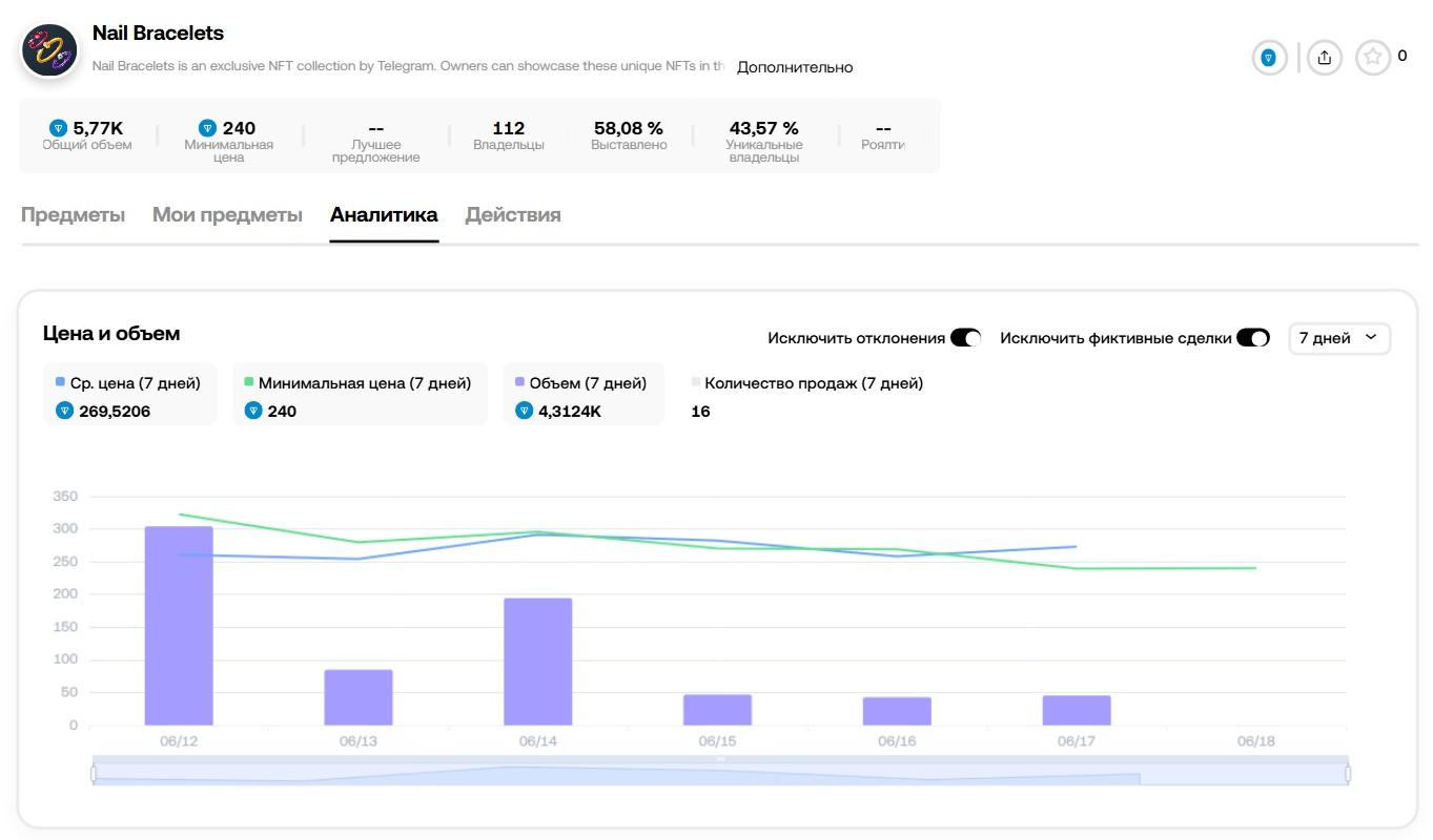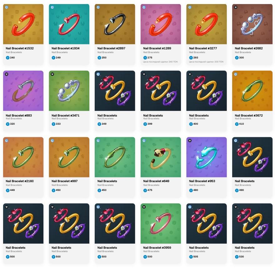 НФТ-подарки Nail Bracelet в ТГ изначально стоили 10 000 звезд, 41 TON или $160. За короткий срок стоимость хорошо выросла – до 240 TON или $690. Сейчас предметы стоят от 240 до 530 TON. Приобрести их можно на сайте web3.okx.com. В продаже осталось мало – чуть более 20 штук.