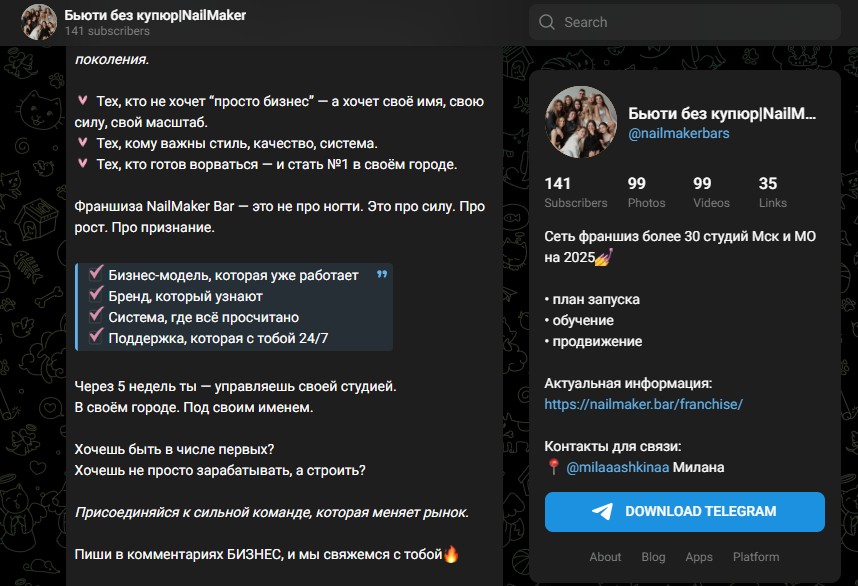 Телеграмм-канал проекта «Бьюти без купюр NailMaker» (@nailmakerbars), который должен быть центром комьюнити, насчитывает всего пару сотен подписчиков. Довольно странная ситуация для сети, где якобы десятки студий и «собственное маркетинговое агентство». Значит, реального сильного бренда и сообщества за проектом нет.