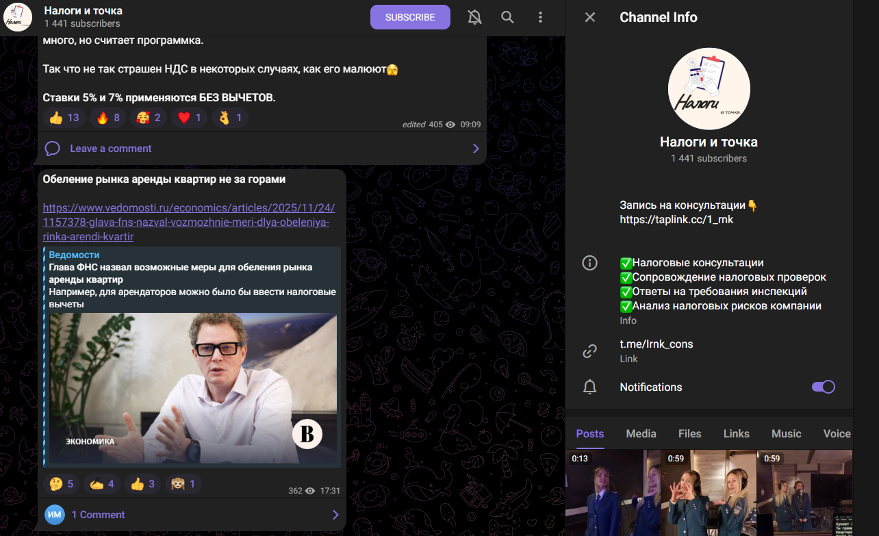 Телеграмм Налоги и точка — сообщество компании 1РНК, юридическая помощь и налоговое сопровождение корпоративных и частных клиентов. Штат сотрудников небольшой, но опыт в сфере налогообложения более 12 лет.