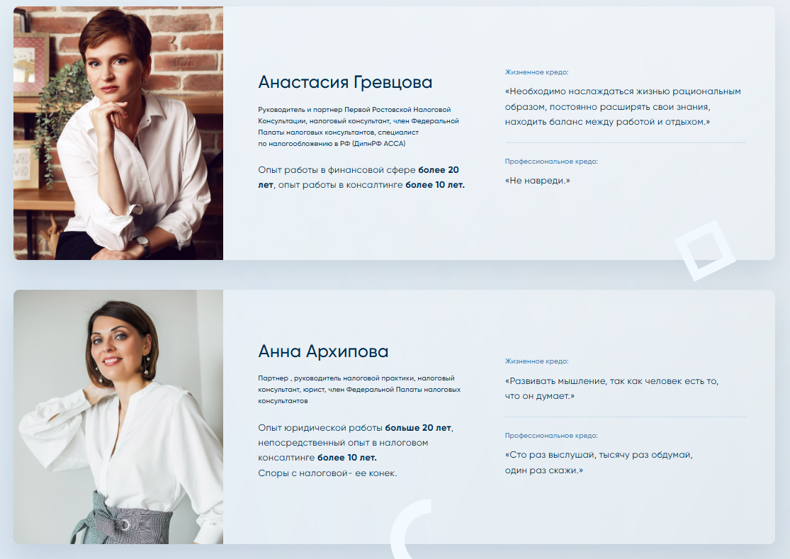 На сайте компании представлен весь штат сотрудников с регалиями. Контора работает более 12 лет и ведет свыше 100 клиентов в год. Читатели могут ознакомиться со статьями в блоге, а также в СМИ. На платформе есть кейсы клиентов, а также опубликованы сертификаты и другие документы, подтверждающие как квалификацию специалистов, так и легальность осуществляемой деятельности.