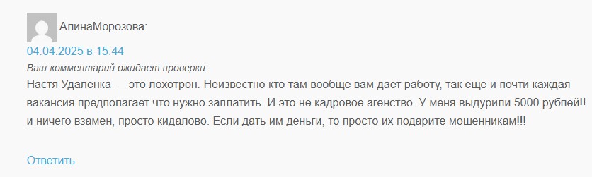 Что же говорят отзывы о канале «Настя Удаленка» в сети? По большей части люди откровенно ругаются, жалуются на обман и потерянные деньги. Энтузиазма по поводу «работы мечты» от Насти почему-то нигде не наблюдается.