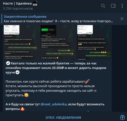 Канал в Телеграмме Nast Udalenka позиционирует себя как настоящий Клондайк для тех, кто мечтает о работе на дому – в уютных тапках, с чашкой кофе и без назойливого начальства над душой. Автор канала, некая Настя, обещает подписчикам золотые горы: лучшие удаленные вакансии, выгодные подработки и исключительно «проверенные предложения». Звучит, конечно, очень заманчиво. Однако, как показывает практика, не все то удаленка, что без офисного стола, и за красивыми обещаниями часто скрываются не самые приятные сюрпризы.