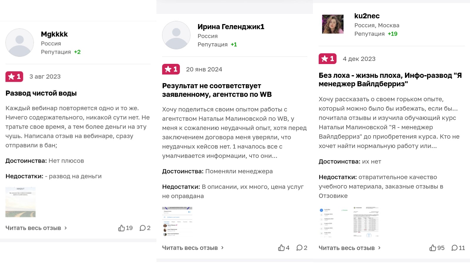 На тематических площадках мы нашли отрицательные отклики об обучении автора. Как пишут в отзывах, Малиновская Наталья Александровна продает некачественные курсы по работе на Wildberries.