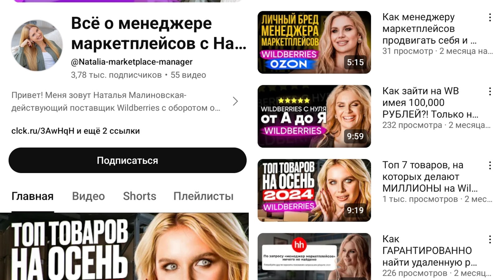 Всего опубликовано 55 видео. Они посвящены информации о товарах с большим оборотом и советам по поиску удаленной работы. Также автор ведет канал в Телеграмме. Контент там напоминает другие социальные сети.Школа Wildberries Наталья Малиновская: информация о бесплатных мастер-классах и платных курсах