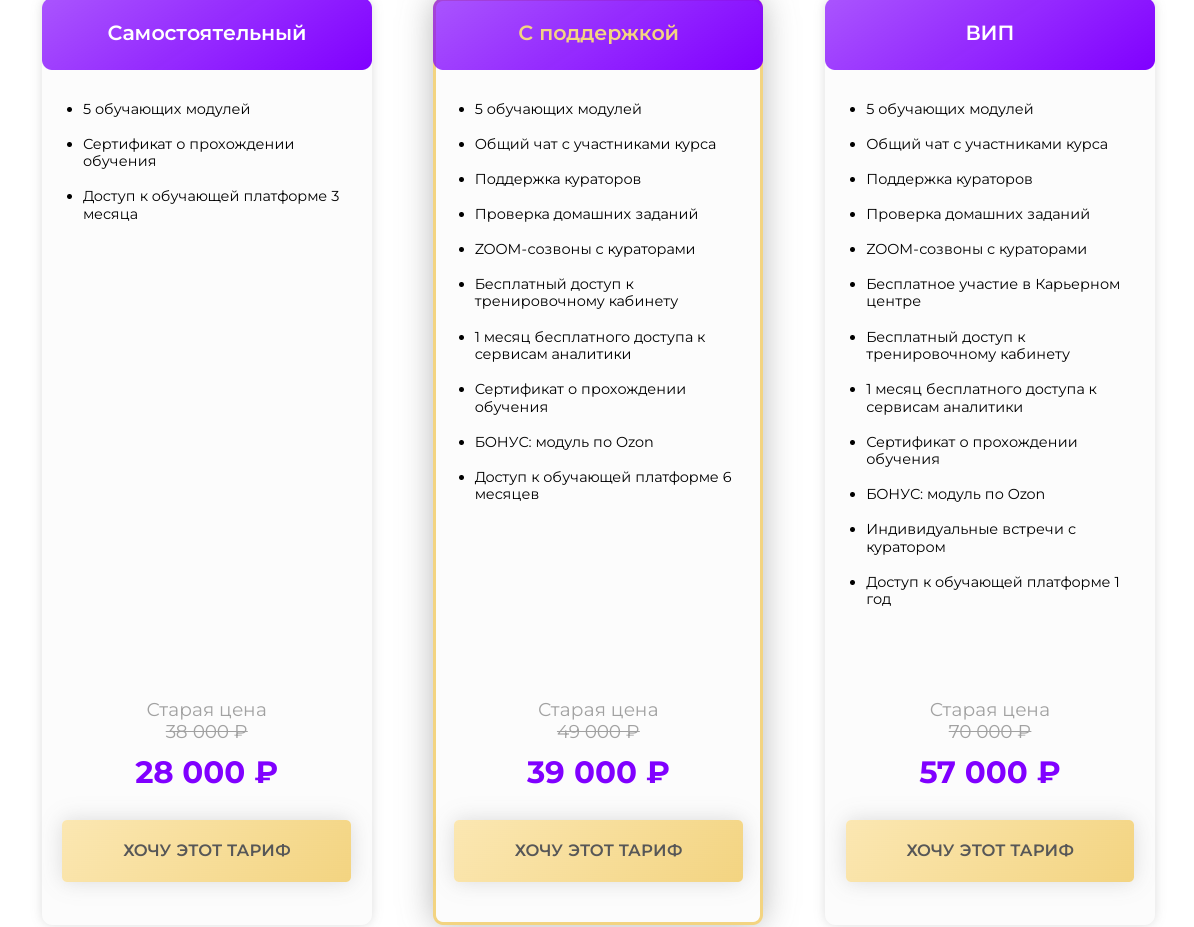 - С поддержкой. Есть совместный чат с другими участниками, созвоны с наставником. Также 1 месяц доступа к аналитическим сервисам и бонусы. Стоимость — 39 тыс. рублей;
