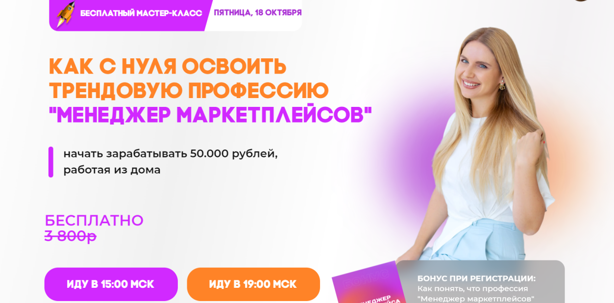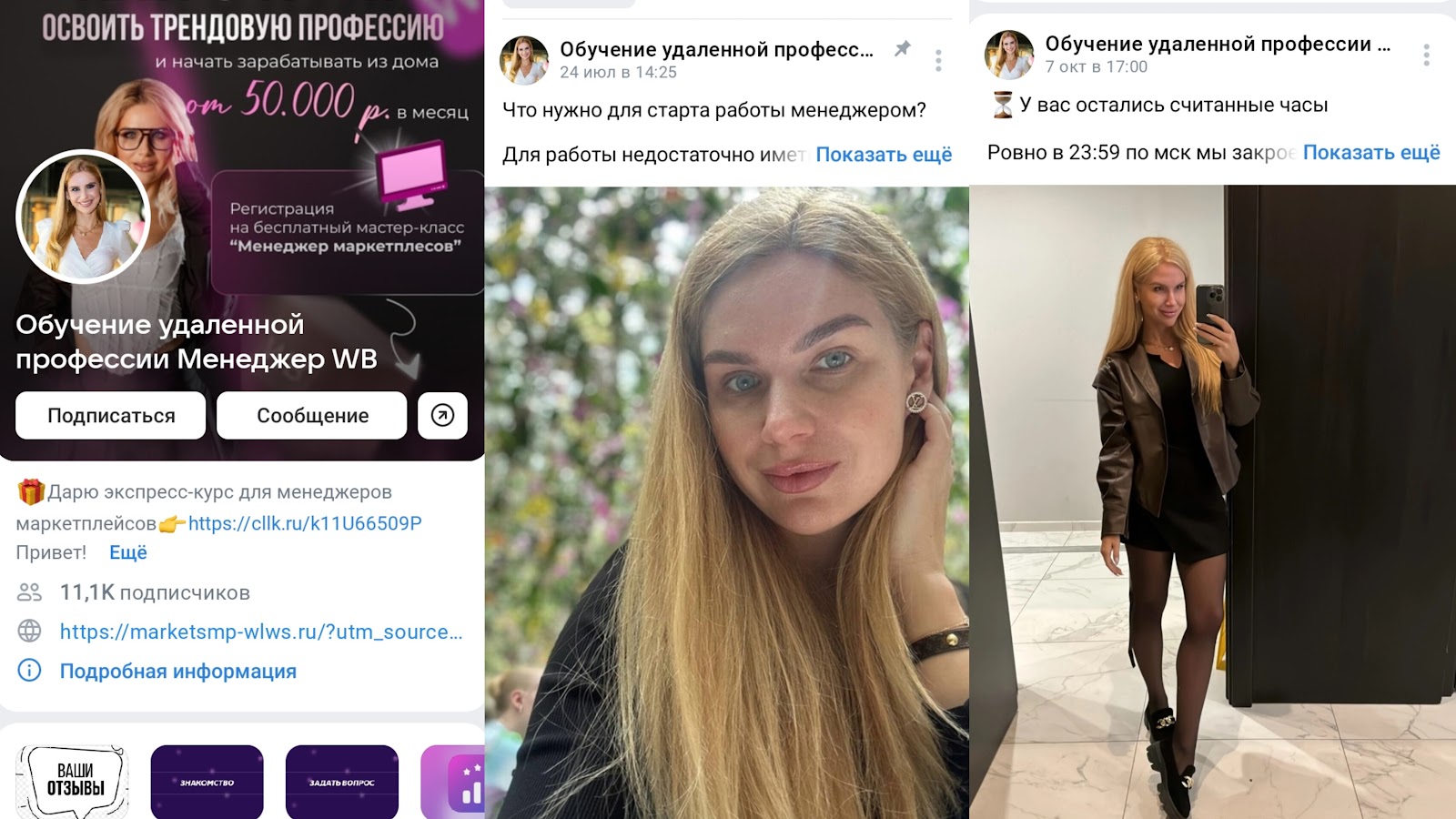 Наталья активно продвигает свою школу MP Skill. Сейчас пользователям предлагают участвовать в бесплатном мастер-классе “Менеджер Маркетплейсов”. За 2 часа обещают научить нюансам работы в личном кабинете, предоставить стратегию старта. Также научить выйти с 0 на доход от 50 000 рублей.