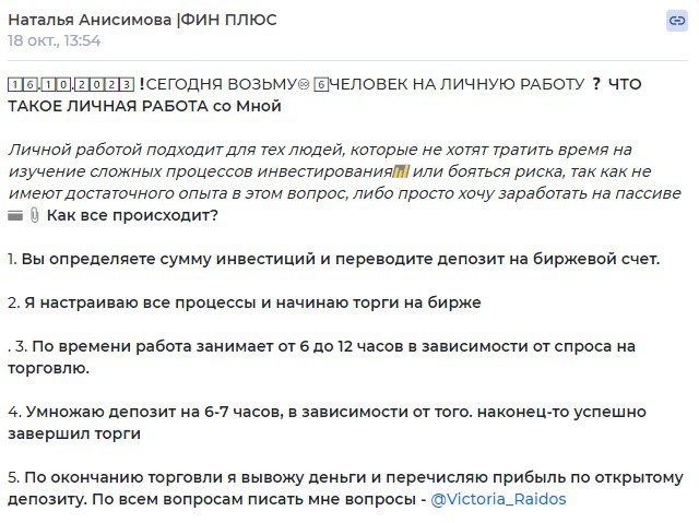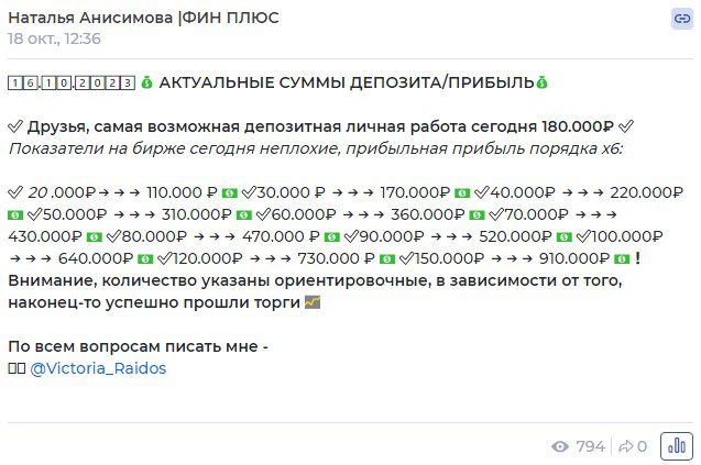 Изначально в качестве админа канала выступала некая Наталья Анисимова (учетная запись в Телеграм — anisimova_plus). Это известная в определенных кругах астролог. Но позже в постах стала появляться учетная запись Виктории Райдос — Victoria_Raidos. Она является популярным экстрасенсом. Очевидно, что ни одна из них не имеет никакого отношения к лохотрону Наталья Анисимова | FIN PLUS. Смена аккаунта произошла после того, как на официальном ресурсе реальная Анисимова опубликовала пост о данном лохотроне и предупредила всех своих подписчиков не связываться с ним.