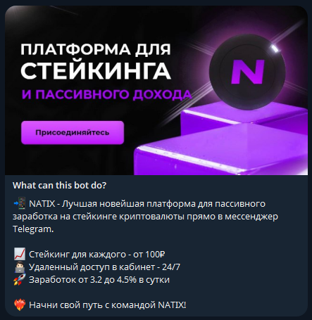 По видимой информации, бот предлагает: регистрацию и пополнение внутри Telegram, краткосрочные «планы доходности» с обещаниями быстрых выплат, реферальную систему и платный VIP-доступ с «сигналами» или повышенными условиями. В рекламных постах иногда указывают очень высокие процентные показатели для привлечения. Пользователям обещают доход от 3.2% до 4.5% в сутки за счёт «стейкинга криптовалют» в Natix Робот, доступ к личному кабинету 24/7 и старт с минимальной суммы от 100 рублей.