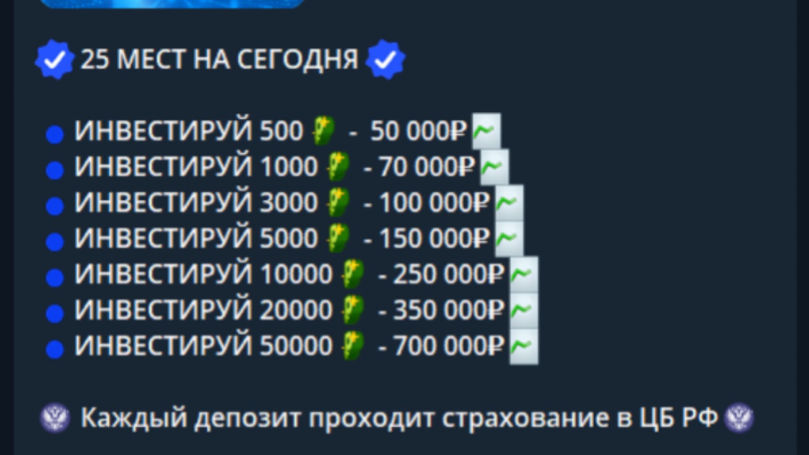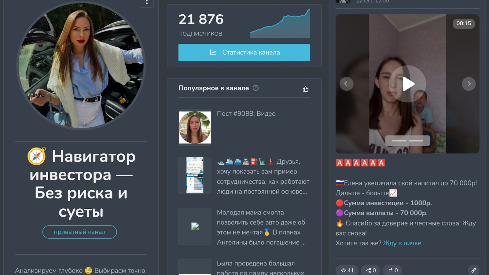 С наибольшим вложением в 50 т. р. якобы можно заработать 700 тыс. р. В блоге часто админ демонстрирует результаты по работе с клиентами. Например, по словам создателя тгк, с вложения в 5 тыс. р. клиент смог получить 150 т. р. Как указывается в постах, депозиты проходят страховку, а за работу инвестор с командой берет процент дохода. Места на работу имеют ограничения, и для уточнения деталей сотрудничества, таких как методы оплаты, нужно обратиться к Екатерине в лс.