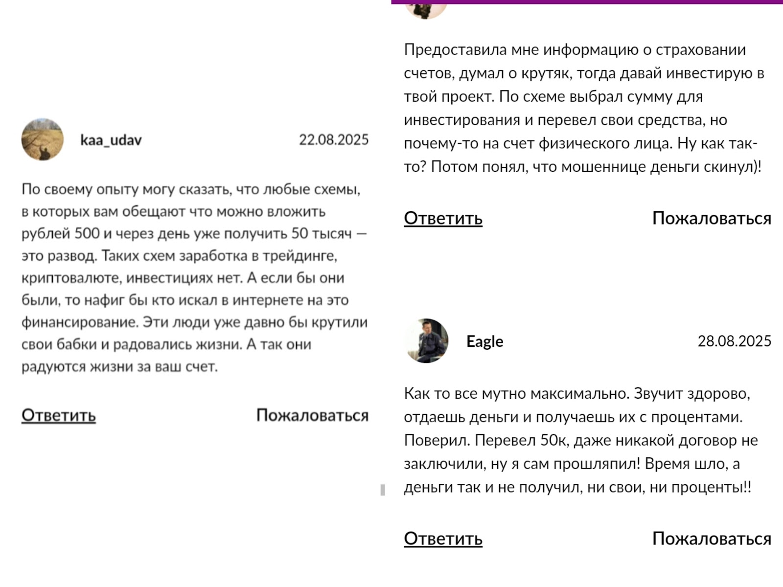 Инвестор Екатерина использует чужие фото и видео, выдавая на свои, и ничем не подтверждает экспертность в инвестировании. Предлагаемая услуга по раскрутке часто встречается в сообществах с признаками обмана, и, как доказывают отзывы, создатель проекта не выплачивает клиентам средства. Из ключевых фактов мы выделили: