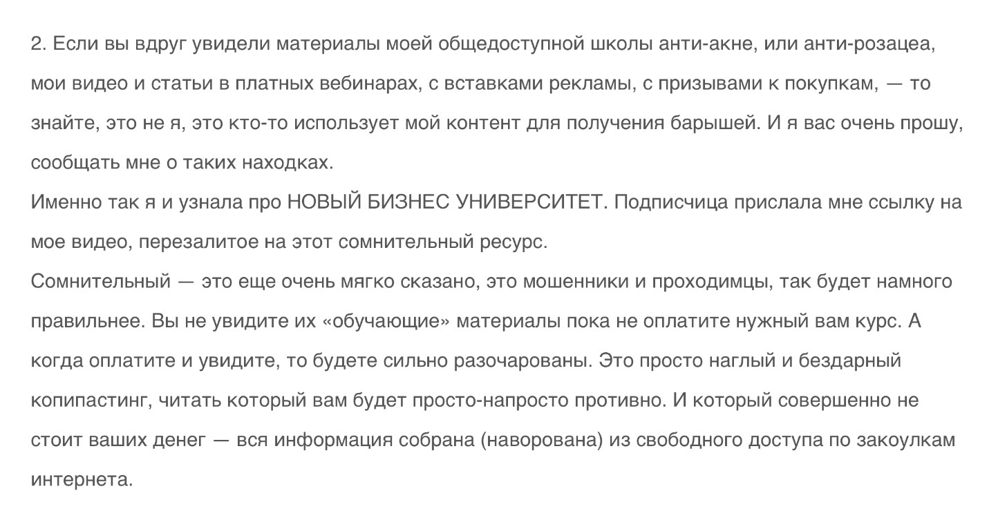 Но самое вкусное впереди. Одна из врачей-косметологов сообщила, что ее видео этот образовательный проект презентует как свое, хотя не получал на это никакого разрешения. Налицо нарушение законодательства об авторском праве.