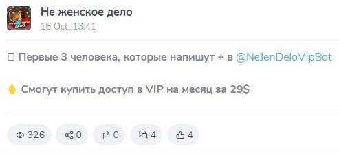 Для того чтобы попасть в VIP-сообщество, необходимо следовать рекомендациям чат-бота @NeJenDeloVipBot. Стоимость подписки в закрытый чат, постоянно меняется. В одних сообщениях можно увидеть информацию о том, что подписка на месяц стоит 29$, а в других — 10$ на неделю.Проект Не женское дело создан только с одной целью — заработать на доверчивых подписчиках. Заработок мошенника включает в себя, как получение денег в результате подписки на ВИП-ресурс, так и получение вознаграждения от биржи за новеньких клиентов, пришедших по реферальной ссылке мошенника.