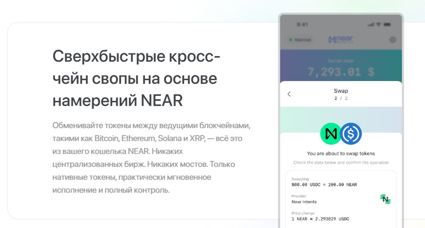 NEAR Blockchain Mobile Wallet относится к некастодиальным видам кошельков. Это означает, что безопасность платформы на довольно высоком уровне. В основе софта лежит мультичейн NEAR Intents. Предусмотрена поддержка всех монет блокчейна ERC-20, а также возможность постройки мостов для обмена токенов из других сетей.