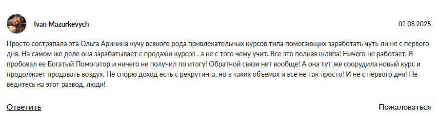 Несмотря на громкие обещания и рассказы о легком заработке, сама Ольга собирает негативные отзывы. Люди отмечают низкое качество курсов и жалуются на отсутствие реально полезного контента / инструкций для заработка в интернете. Также у проекта нет каких-либо гарантий и если после изучения уроков вы не сможете заработать, никто вам деньги не вернет.