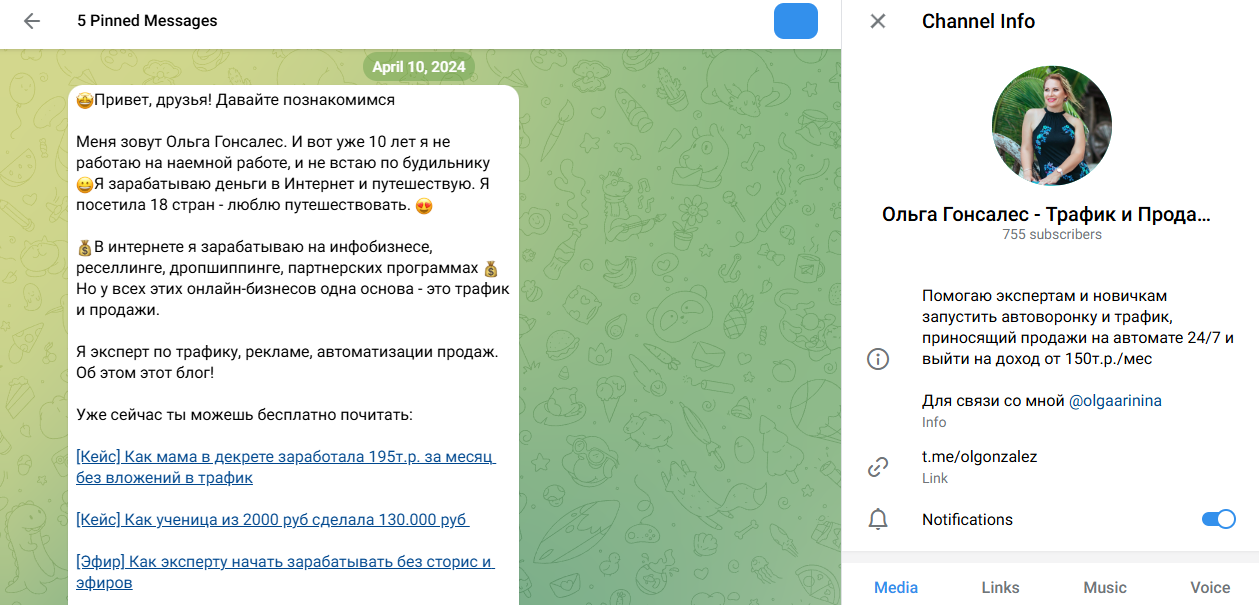 По словам Ольги она занимается заработком в интернете уже более 10 лет и основные сферы ее заработка это: инфобизнес, перепродажи и партнерские программы. Наглядных кейсов заработка на трафике от нее при этом нет, если не учитывать сам телеграм канал, который фактически и является воронкой для продажи курсов.
