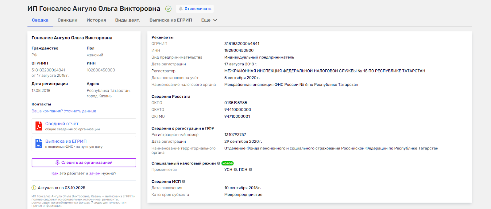 В телеграм она известна под псевдонимом OlgaArinina, а сама девушка официально зарегистрирована и в сети о ней есть информация на странице RusProfile. При просмотре ИП Гонсалес Ангуло Ольга Викторовна можно заметить дату регистрации, это 2018 год, а постановка на учет прошла еще через 2 года, из-за чего заявления о работе на протяжении более 10 лет можно поставить под сомнение.