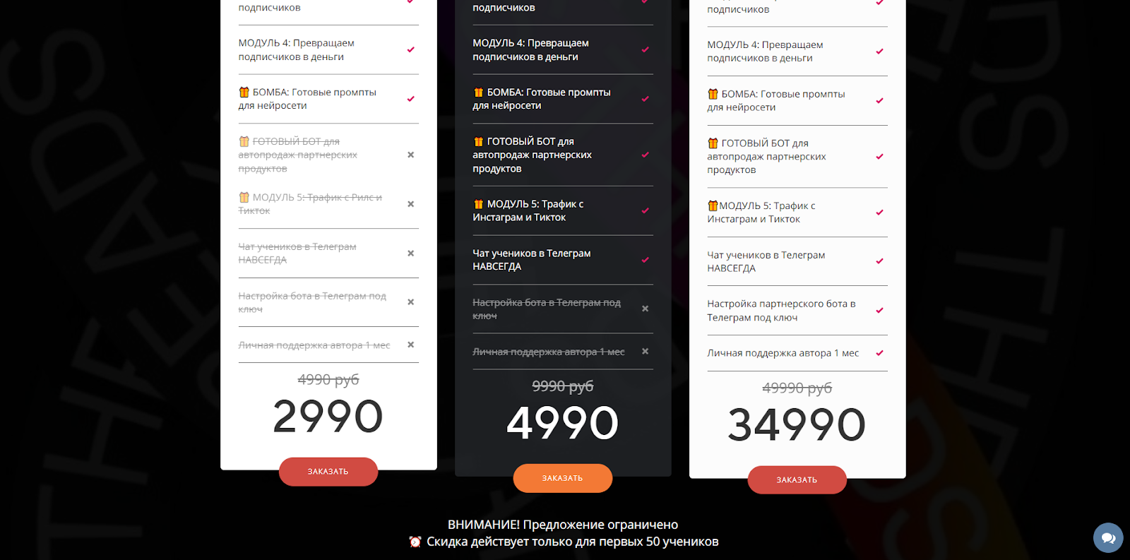 При этом курсы, типа Фабрика Нейро Трафа, где Ольга обещает вести вас за руку до заработка, делятся на несколько планов. Цена максимального из них, где и включена система поддержки составляет целых 35 000 рублей, что на 30 000 рублей дороже минимального плана. При этом оценить ее реальные навыки невозможно.