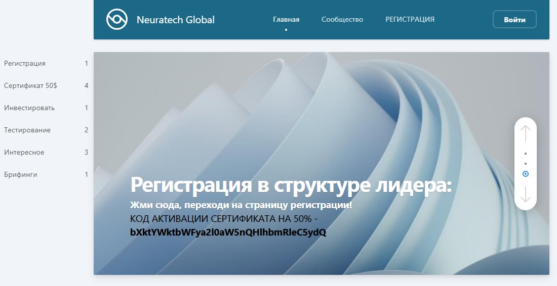 Neuratech Global – это финансовая пирамида, которая функционирует как клон AI_MARKETING. Об этом скаме в интернете уже написано много разоблачений. Официально, это платформа, на которой пользователи могут зарабатывать на кэшбэк-сервисе с помощью нейробота. Новые пользователи могут получить подарочный сертификат на $50 для тестирования сервиса Ai Marketing 2 0.