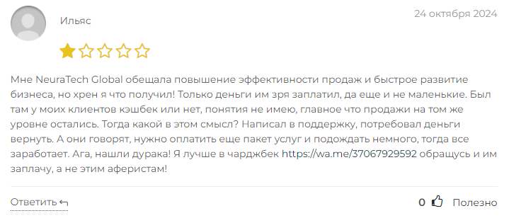 Проект стартовал 8 октября 2024 года, но уже появились разоблачения этой финансовой пирамиды. Как пишут большинство пользователей в отзывах, Neuratech Global – это скам. Основные претензии связаны с тем, что после внесения средств пользователи сталкиваются с отсутствием поддержки и невозможностью вывести деньги.