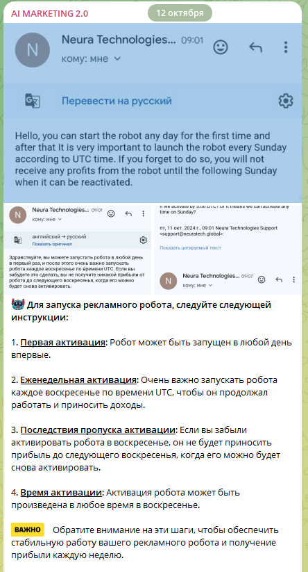 В том, что бота Neura Technologies Global необходимо активировать, заключается развод. Каждый раз, когда он останавливается, повторная активация – платная. Кроме того, даже первые подаренные $50 не переводятся в личный кабинет, если пользователь не внесет депозит.