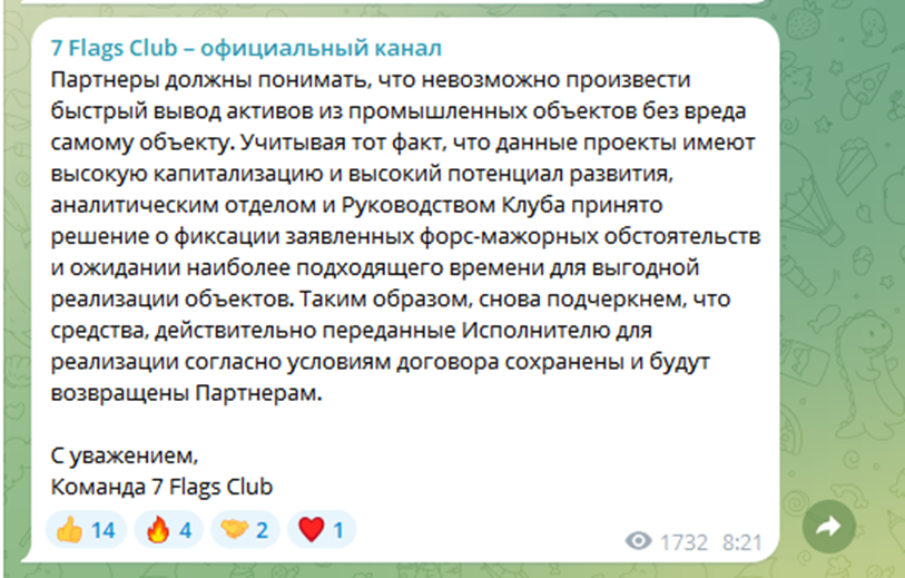 Отзывы, а также посты из ленты 7 Flags Club подтверждают, что у компании серьезные проблемы с выплатами. Создатели пирамиды объясняют неурядицы наступлением форс-мажора. Но их слова не соответствуют действительности – на территории России официально не вводилось ЧС, другие специальные режимы, подтверждающие действие факторов непреодолимой силы. И это не первое попытка успокоить вкладчиков липовыми объяснениями, почему у компании нет денег. Хотя она регулярно показывает прибыль и заявляет о начислении процентов.Социальные сети проекта