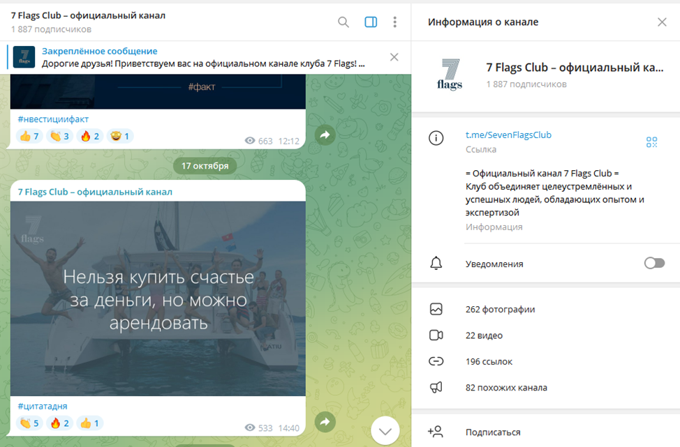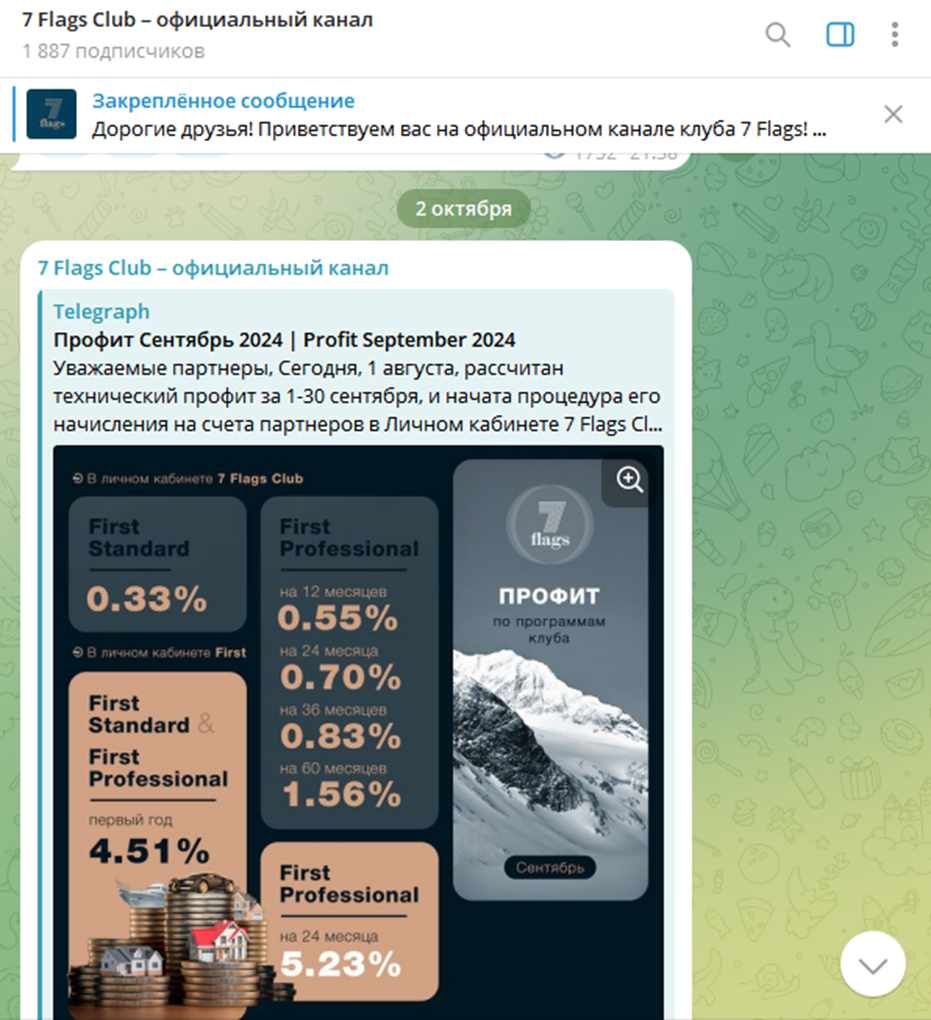 Принцип абсолютной закрытости распространяется не только на сайт New Sevenflagsclub. Политика касается и социальных сетей, хотя это странно для компании, желающей привлечь больше клиентов и инвестиций. Единственный открытый источник информации – официальный канал 7 Flags Club в Telegram. На ленту в середине октября 2024 года было подписано 1,8 тыс. человек. Сам ресурс представляет собой микс сервисных сообщений, анонсов мероприятий, заявлений о начислении процентов и странных цитат. Последние якобы должны снижать уровень гнева вкладчиков на фоне негативных новостей.