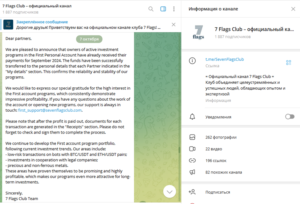При действующем телеграмм-канале 7Flags Crypto нет аккаунта службы тех. поддержки, как это обычно бывает у нормальных компаний. Единственный способ связи с координаторами для тех, кто не является участником пирамиды – электронная почта First Support Sevenflagsclub Com. Именно этот адрес проскакивает в некоторых новостях из Телеграма.