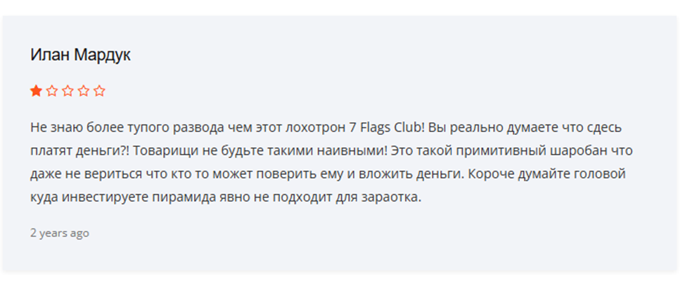 Под личиной Sevenflagsclub Com скрывается классическая МЛМ-пирамида, которая только хочет казаться успешной и прибыльной инвестиционной компанией. Единственное, что хорошо получается у мошенников – регулярно выходить на связь и кормить клиентов обещаниями, Вероятно, только из-за надежды на возможный возврат депозита к владельцам до сих пор не пришли правоохранительные органы. Мы рекомендуем держаться подальше от 7Flags и похожих пирамид, да и в целом скептически относится к обещаниям большой доходности без риска.