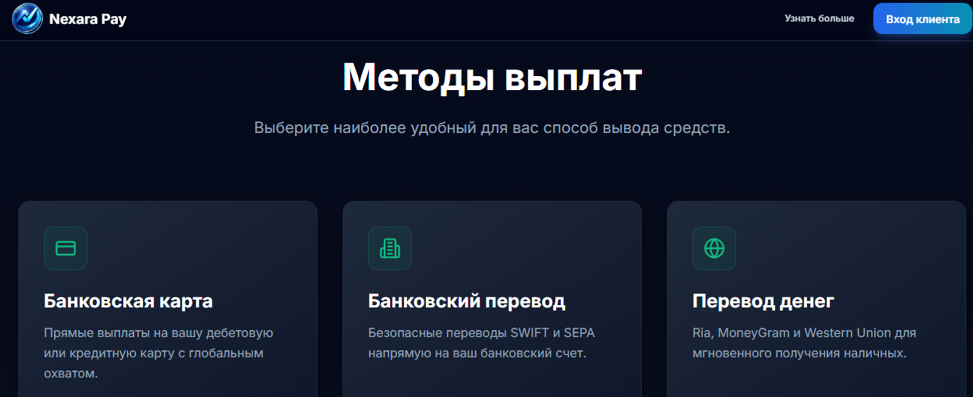 Принцип сотрудничества с проектом весьма прост – клиентам предстоит пройти всего три шага. Первый – пройти регистрацию на Nexara pay. В настройках аккаунта следует указать платежные данные и предпочтительный способ вывода средств.