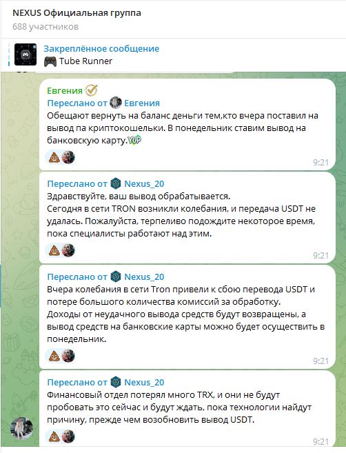 Даже в тг канале наблюдаются тревожные звоночки о проблемах с выводом на криптокошелек, которые сваливают на технические проблемы.