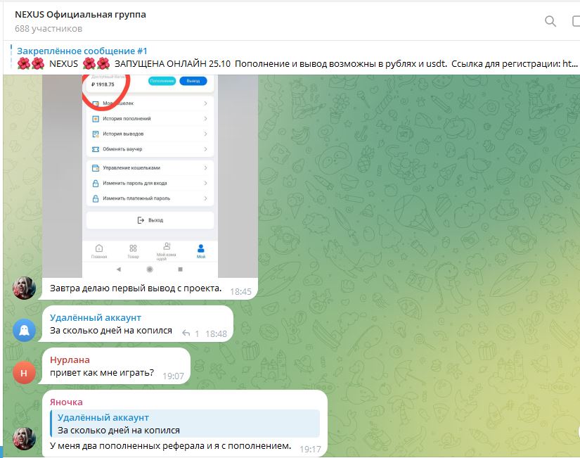 Первые участники Нексус 666 уже успели вывести деньги и радуются своей прибыли. Вот одна из таких историй, опубликованная в закрытом канале тг. В проект залили 7.5 тысяч рублей, пригласили два друга и через несколько дней поставили на вывод 1900 рублей. С вычетом комиссии пользователь получит 1615 р. При этом, хочет еще залить дополнительно денег.