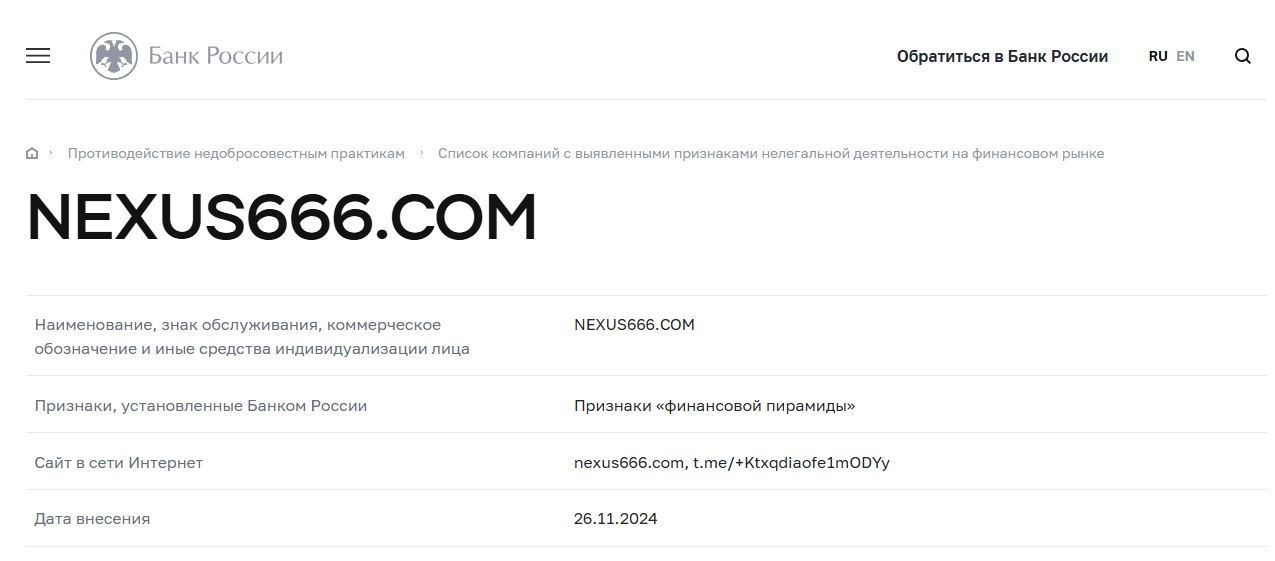 Во-вторых, Центральный банк России признал nexus 666 финансовой организацией с признаками нелегальной деятельности, найдя в ней признаки пирамиды.