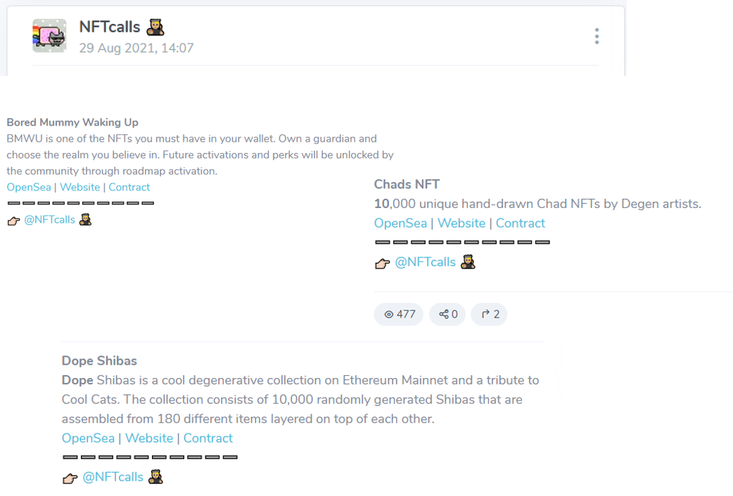 Пользователям подают свежие анонсы и якобы инсайды с первых рядов цифровой арт-сцены.Хотите поучаствовать в раннем дропе и урвать редкость до массовки? Ловите ссылку, но держите голову холодной — рынок не про милые картинки, а про высокие риски и безжалостный FOMO. Также через ссылки на Discord и Twitter подписчики могут взаимодействовать с сообществами и авторами проектов.