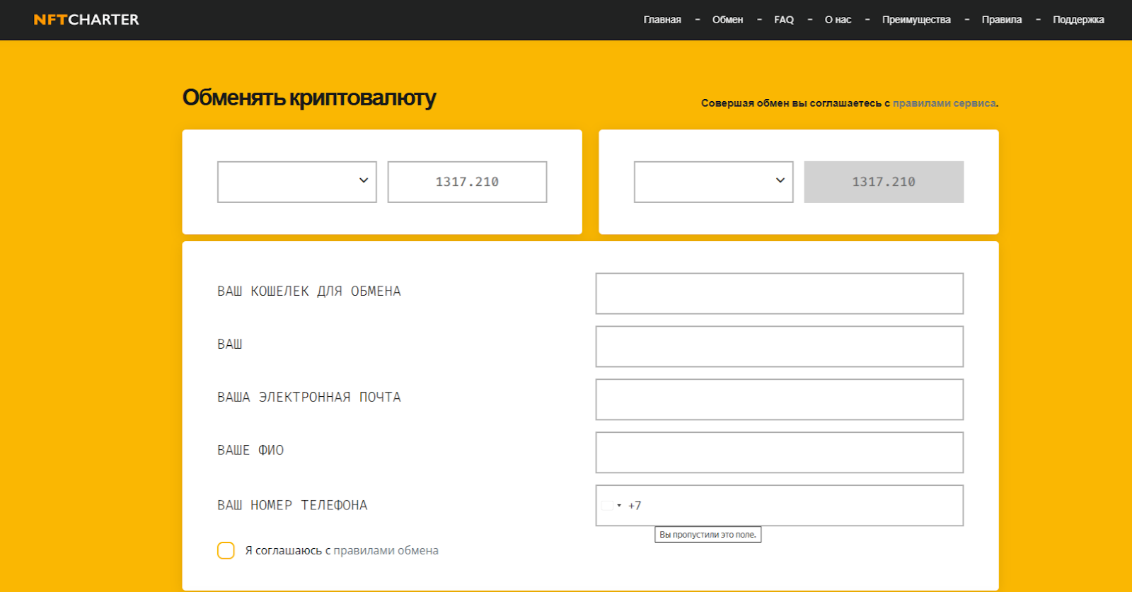 Для обмена виртуальных средств на сайте NftCharter не нужно регистрироваться. Достаточно заполнить специальную форму: кошелек, электронная почта, ФИО и т. д. После чего следует согласиться с правилами сервиса и внести депозит. В некоторых случаях администрация обменника может запрашивать у посетителей конфиденциальную информацию: паспорт, фото карты.