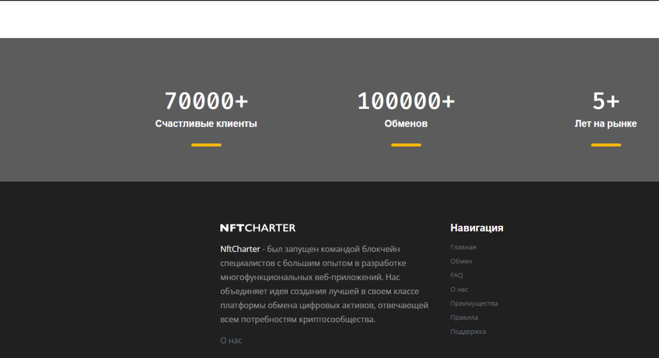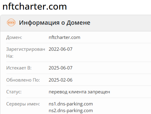 Проверка сайта nftcharter com показала, домен был зарегистрирован 7 июня 2022 года. ПО было обновлено 6 февраля 2025 года. Даже если брать за основу время создания официального сайта, компания не работает в сфере обмена более 5 лет. Администрация просто обманывает пользователей, рассказывая о несуществующем опыте.