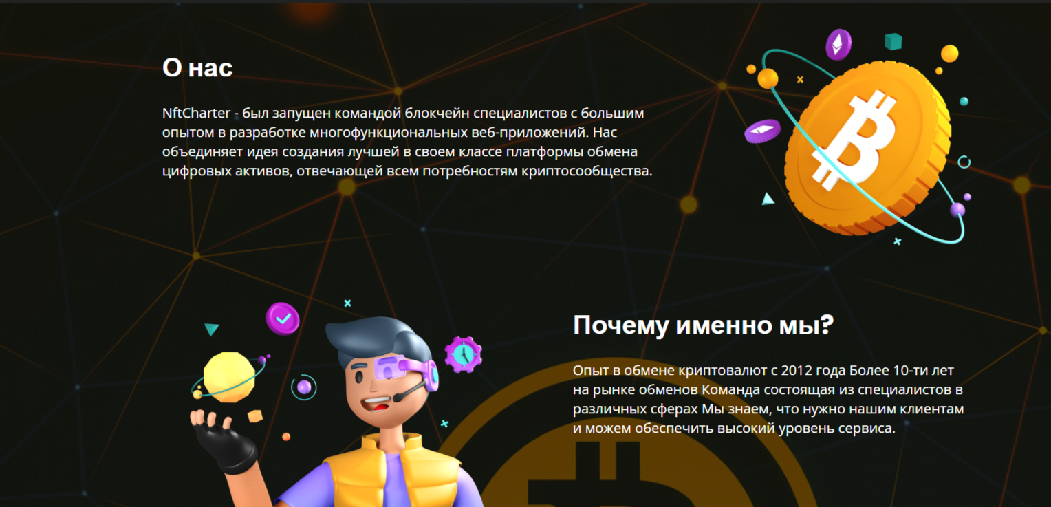 Деятельность криптовалютного обменника NftCharter обладает элементами развода и обмана. Сервис привлекает целевую аудиторию красивыми нереалистичными обещаниями. К минусам стоит отнести: