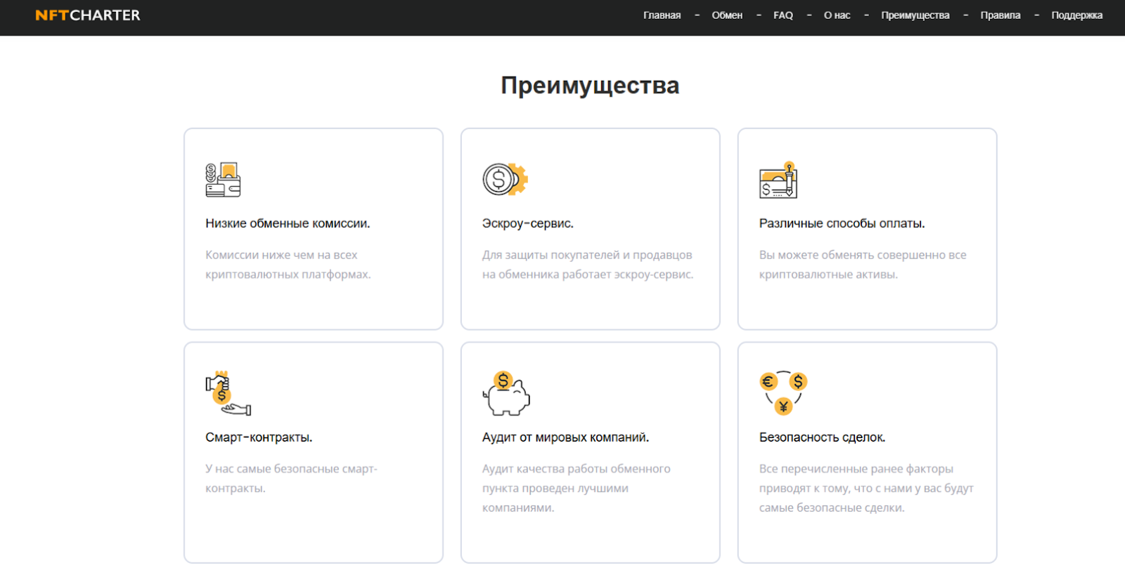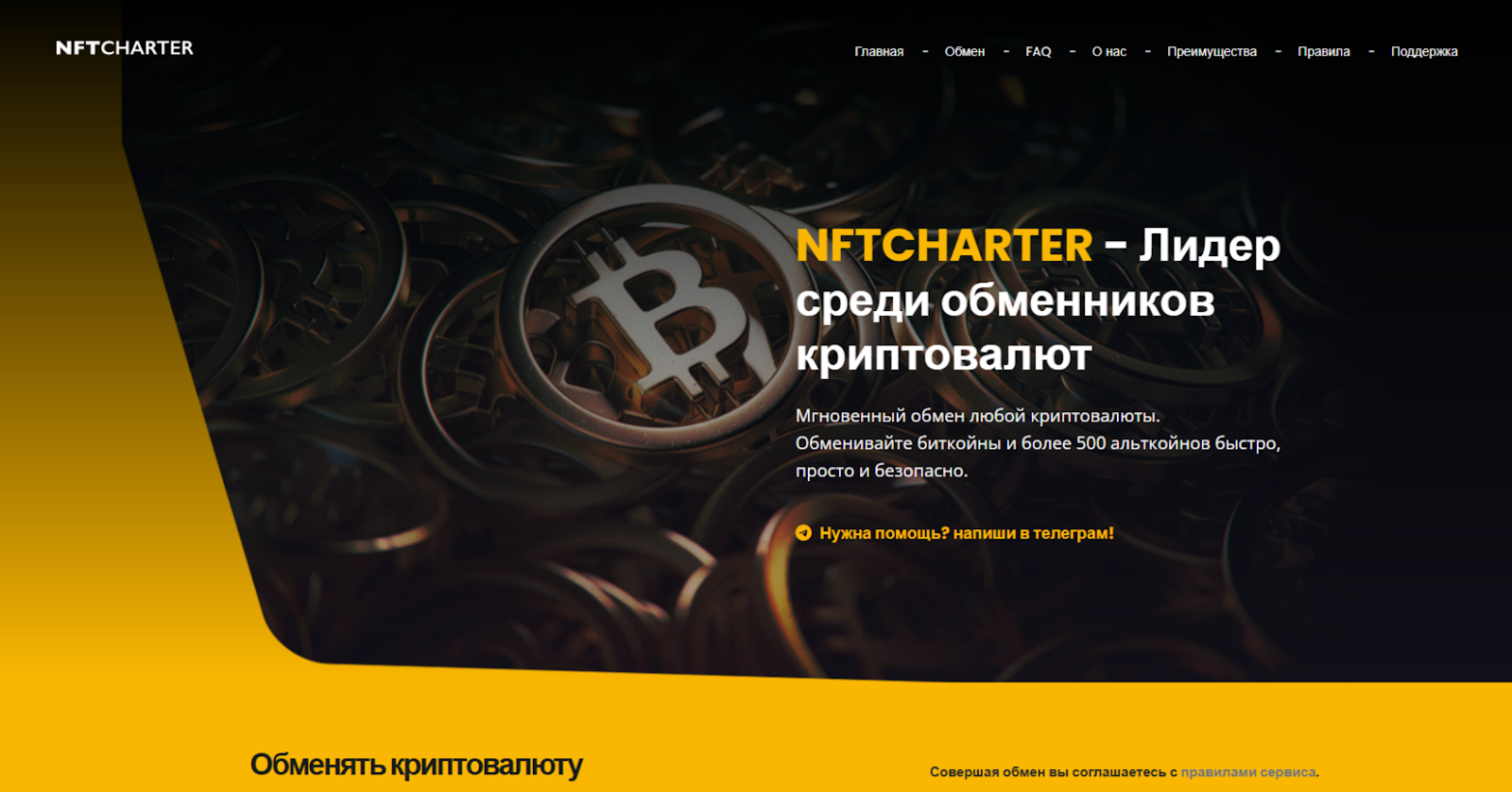 NftCharter – криптообменник, мало чем отличающийся от своих конкурентов. Сервис предлагает посетителям анонимный обмен цифровых активов. На сайте пользователи могут обменять биткоины и 500+ альткоинов. Обменный пункт обещает своим клиентам целый ряд преимуществ: