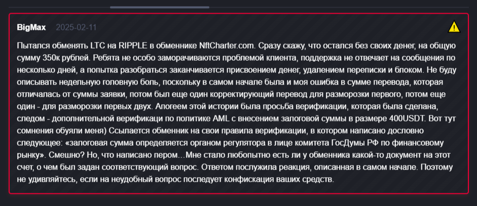 Криптовалютный обменник «Нфт Чартер» не рекомендован нашей командой никому.