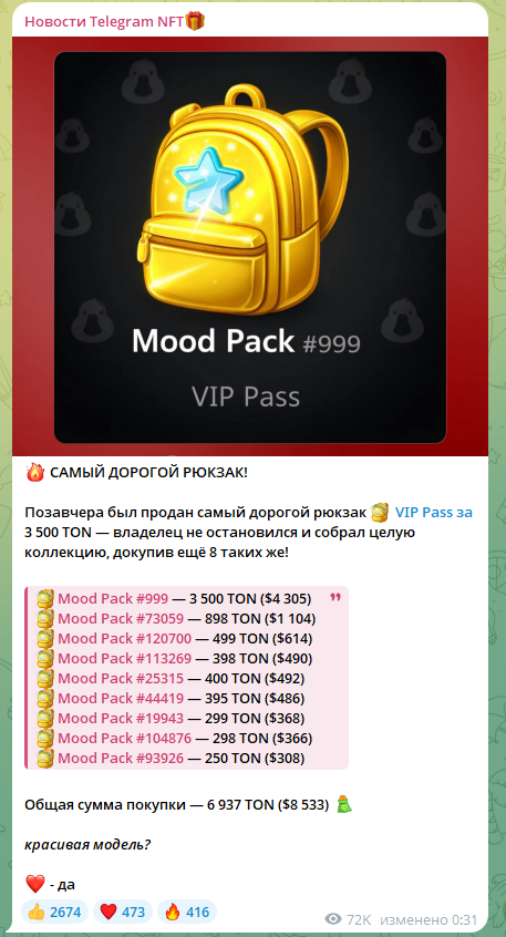 Например, в ленте Ника Гарант в Телеграмме встречаются сообщения о продаже NFT-объектов на тысячи TON и десятки тысяч долларов. Автор освещает сделки на уровне 3 500 TON ($4 305) и совокупные покупки свыше 6 937 TON ($8 533). Также публикуется информация о росте аудитории. Модератор пишет о привлечении 42 893 новых участников рынка за месяц.