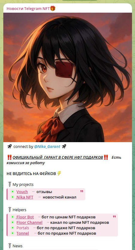 Nika Garant – это информационная площадка в сфере NFT-подарков и цифровых активов внутри Telegram. Проект связан с аккаунтом @Nika_Garant, который заявлен как «гарант» при проведении сделок. Контент сочетает новостные публикации, аналитические заметки и элементы продвижения собственных сервисов.