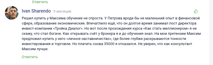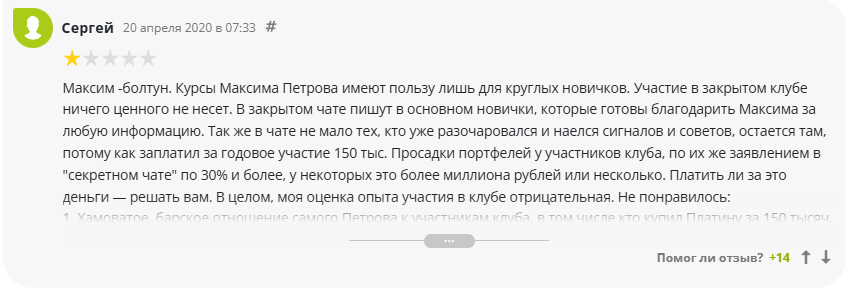 О Сизикове, как об отдельном эксперте, нет отзывов. А о Петрове и MaxCapital есть. И в них преобладает негатив. Мол, спикеры курсов болтуны — льют много воды, дают мизер ценной информации.