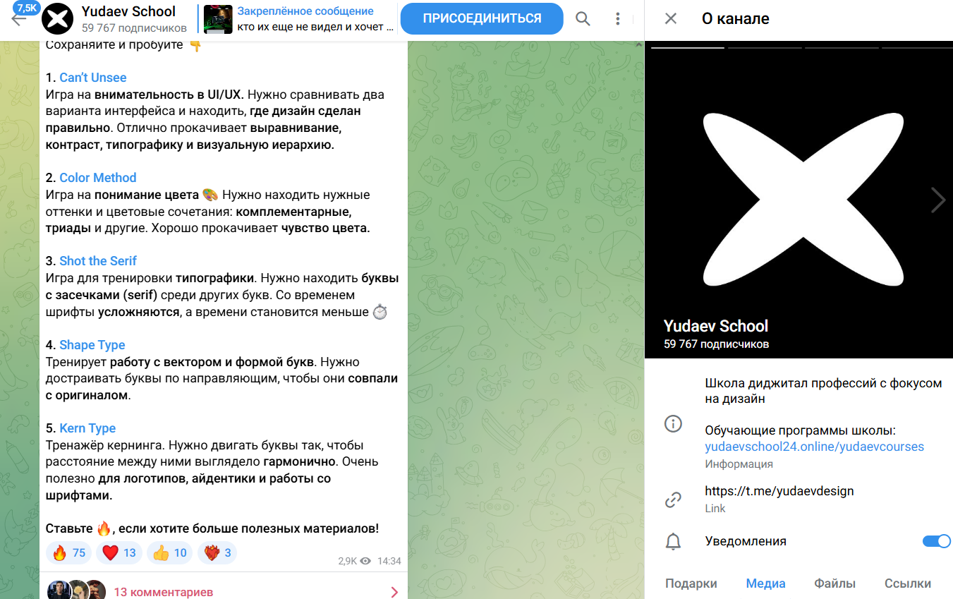 Телеграмм-канал Yudaevdesign был создан в июне 2020 года, и у него более 59 тыс. подписчиков.