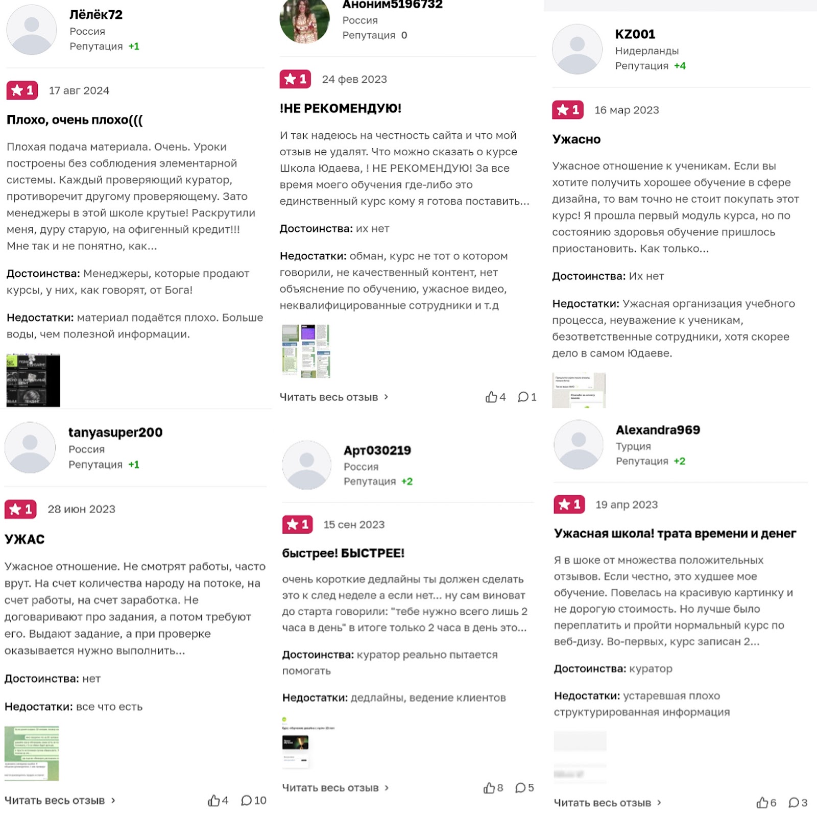Встречаются отрицательные отзывы о курсе по веб дизайну от Юдаев Скул, в которых называют создателя Никиту мошенником (инфоцыганом).
